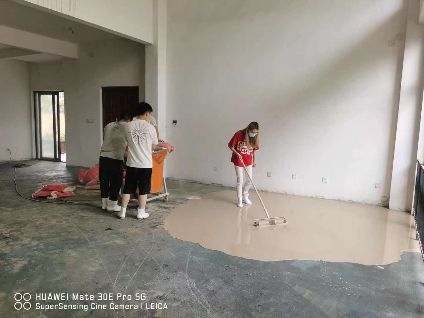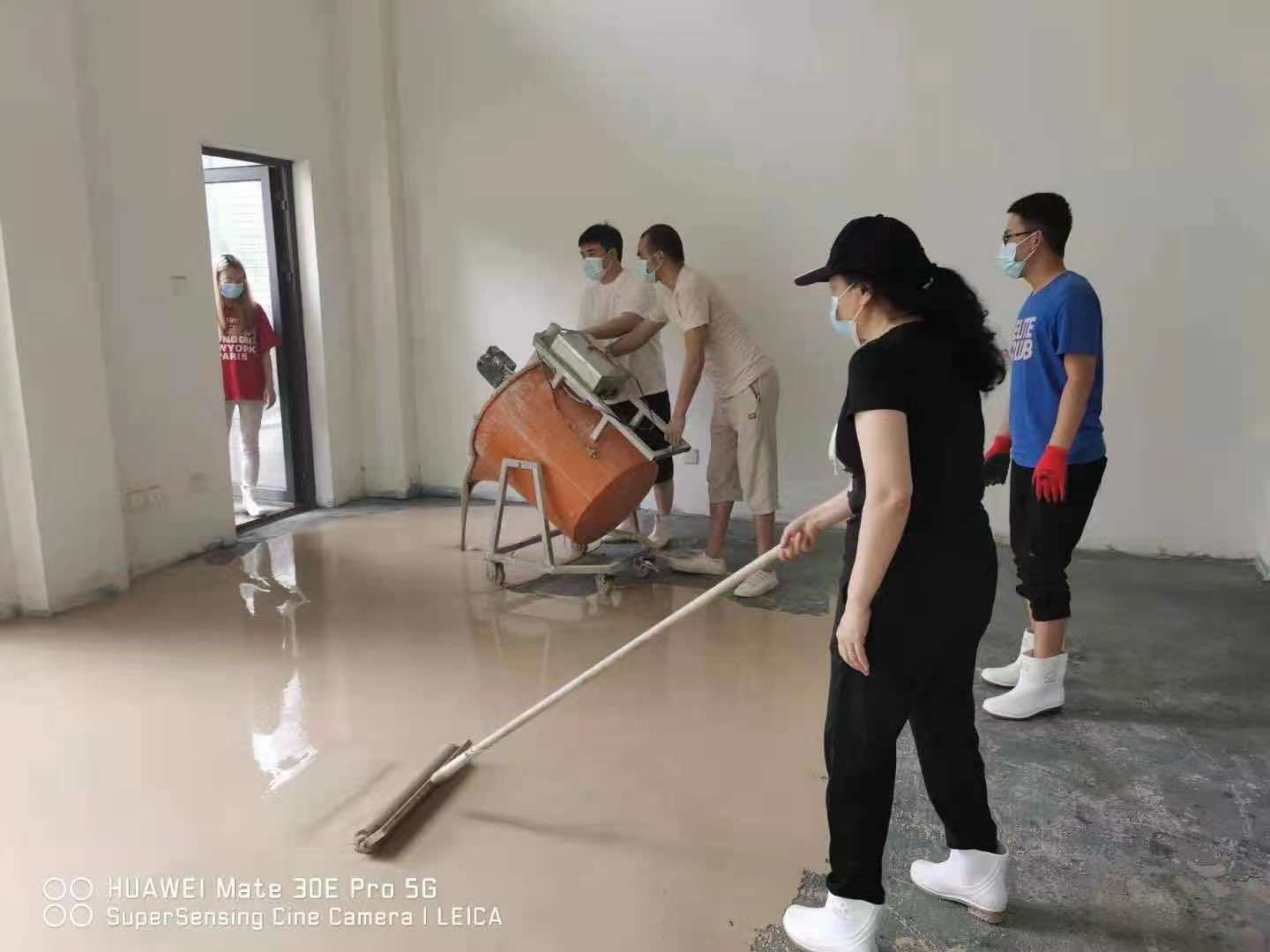 活動開始,建材事業(yè)部部長李茂春組織將到場員工分成兩班組施工,各司其職,各班組有序施工。將一定比例的石膏基自流平與水混入攪拌桶內,持續(xù)攪拌約3分鐘,一次性倒在地面上,自流平的流動性好,產品可以根據(jù)地面的高低不平順勢流動,對地面進行自動找平,無需外力推動。2個班組耗時不到8小時,完成450㎡施工作業(yè),等待24小時后,地面即干燥可使用。我司自產“藍花楹”自流平產品具有品質好,施工便捷高效的特點。