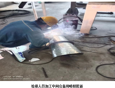 7月7日10:30分在生產丙班做好相關準備工作后,檢修班組員在中間倉開始在線技改,開孔加裝一根備用下料管道。在經過七小時的辛苦工作后,備用下料管道順利完成。下料管道不僅可以備用,還可以在進口SO2過高時,啟動后增加下料量,提高脫硫效率,實現(xiàn)一舉兩得!
